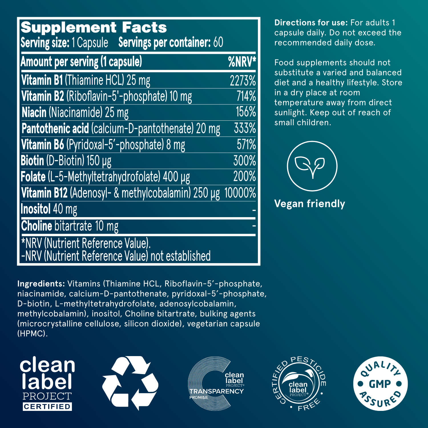 The synergistic blend of B vitamins works together to support the energy production*, cognitive function** and the nervous system***.