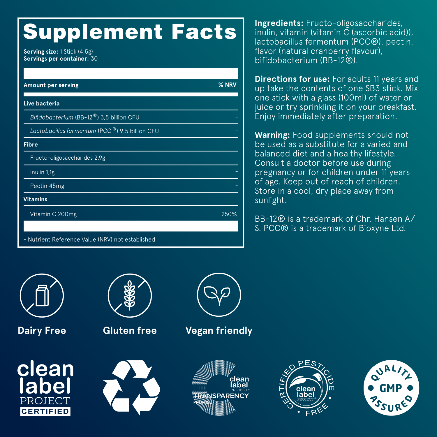 Bifidobacterium BB-12® is one of the most researched probiotic strains and has been tested in more than 300 scientific studies. Lactobacillus fermentum PCC® was awarded the Health Ingredient Excellence Award for its outstanding properties compared to other bacteria strains. The bacteria are freeze dried and activated by liquid.